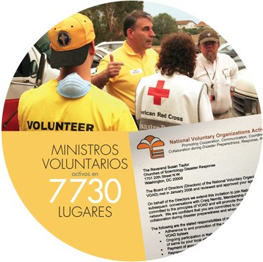 Los Ministros Voluntarios forman equipo con Organizaciones Voluntarias Activas en Desastres (OVAD). Trabajando con miembros de otras OVAD, los Ministros Voluntarios respondieron a los tornados de Oklahoma, al Huracán Sandy y al atentado en la Maratón de Boston. Ministros Voluntarios ocupan cargos ejecutivos en varias OVADs estatales. En Washington D.C., un scientologist sirve en la junta y presidencia ejecutivas de la filial de D.C. de la OVAD Nacional, y como miembro de la subcomisión de Atención Emocional y Espiritual, contribuyó a las directrices en el cuidado emocional y espiritual durante los desastres.